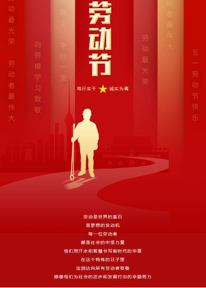 在這個五一勞動節(jié),我們懷著崇高的敬意,向每一位員工表達深深的感謝。你們默默奉獻,為公司的繁榮發(fā)展打下了堅實的基礎(chǔ),是寶潤達最寶貴的財富。同時,我們也要向一直與我們并肩作戰(zhàn)的合作伙伴們表示衷心的感謝。是你們的信任與支持,讓我們能夠攜手共創(chuàng)輝煌。